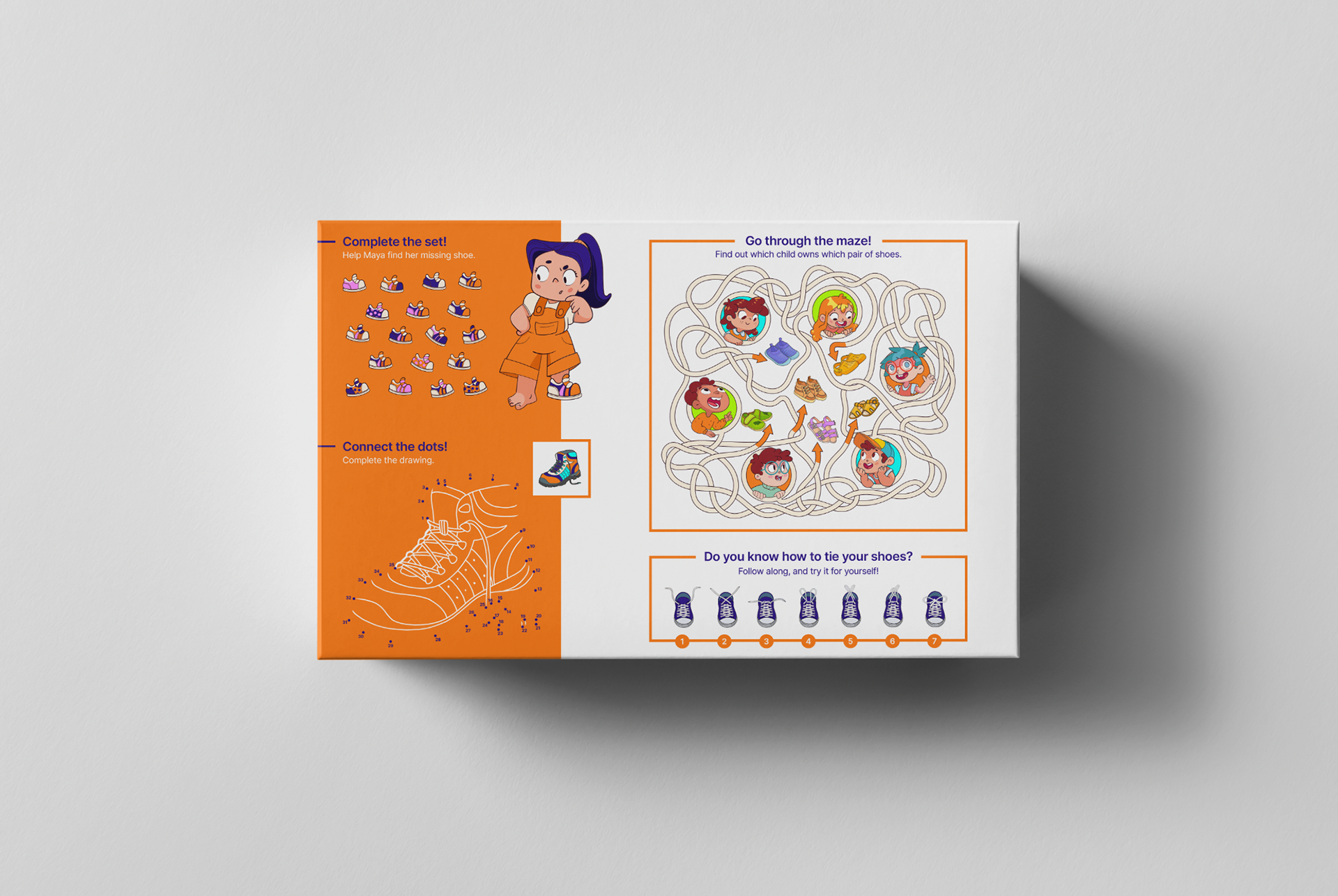 Kids' shoe box design for Washmen Shoe Care. Adding drawing games to a shoebox turns packaging into a fun, engaging experience that builds a positive emotional connection and keeps the brand memorable for children. It also adds perceived value for parents while promoting creativity and encouraging reuse, helping the brand stand out.